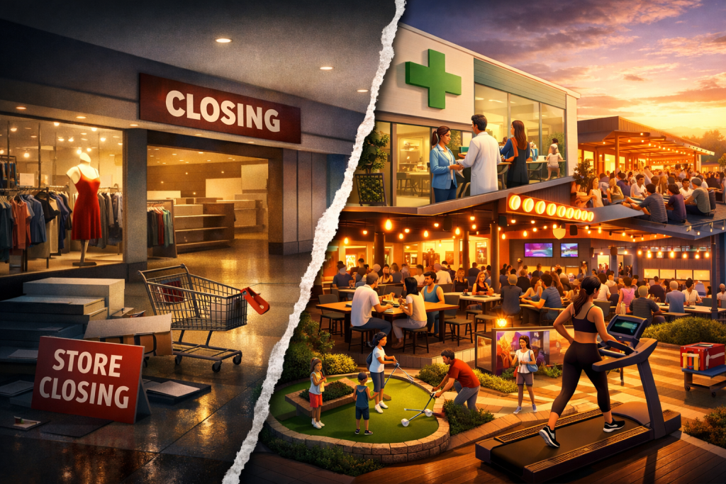 Retail tenant mix has undergone a permanent reset. Apparel and general merchandise — once anchors of the American shopping center — have collapsed to below 25% of composition. Healthcare tenants now occupy 15–20% of well-positioned properties, while dining and entertainment drive 30–35% of successful centers. The owners winning in 2026 started repositioning three years ago.